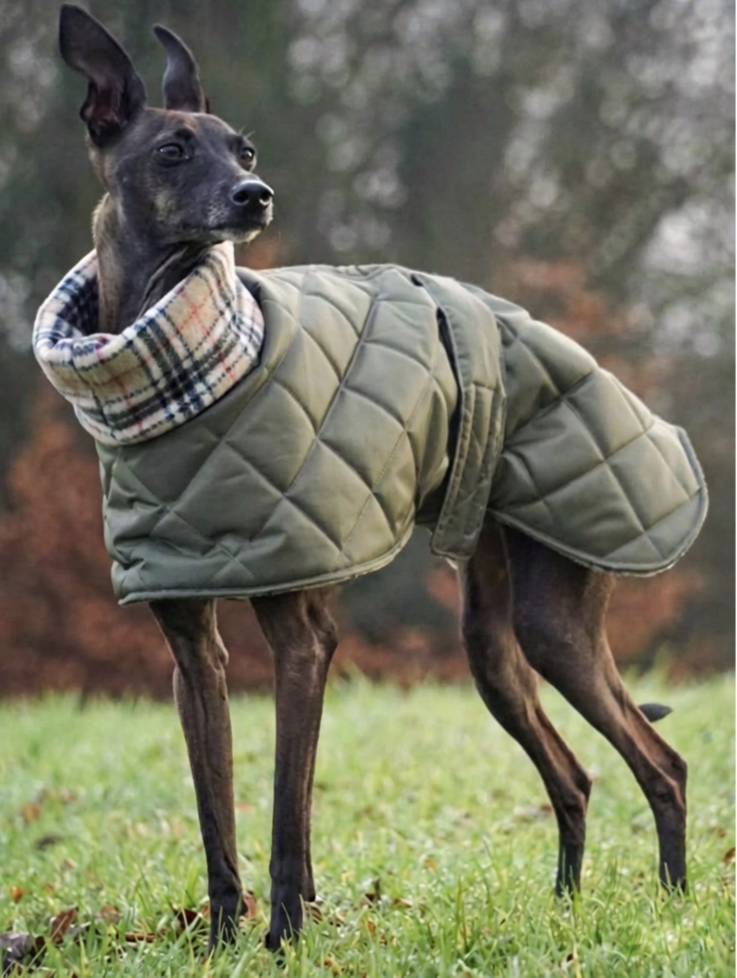 This quilted winter coat is fully lined with soft fleece and carefully shaped to fit the slim body of Italian greyhounds — no slipping, no bulk, just warmth where they need it most.