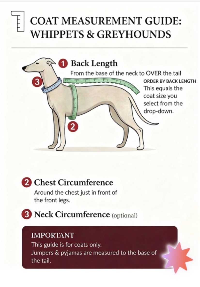 Designed specifically for sighthounds, this coat is shaped to fit the deep chest, slim waist and natural curve of a whippet’s body — so it sits properly, stays secure and allows full freedom of movement.