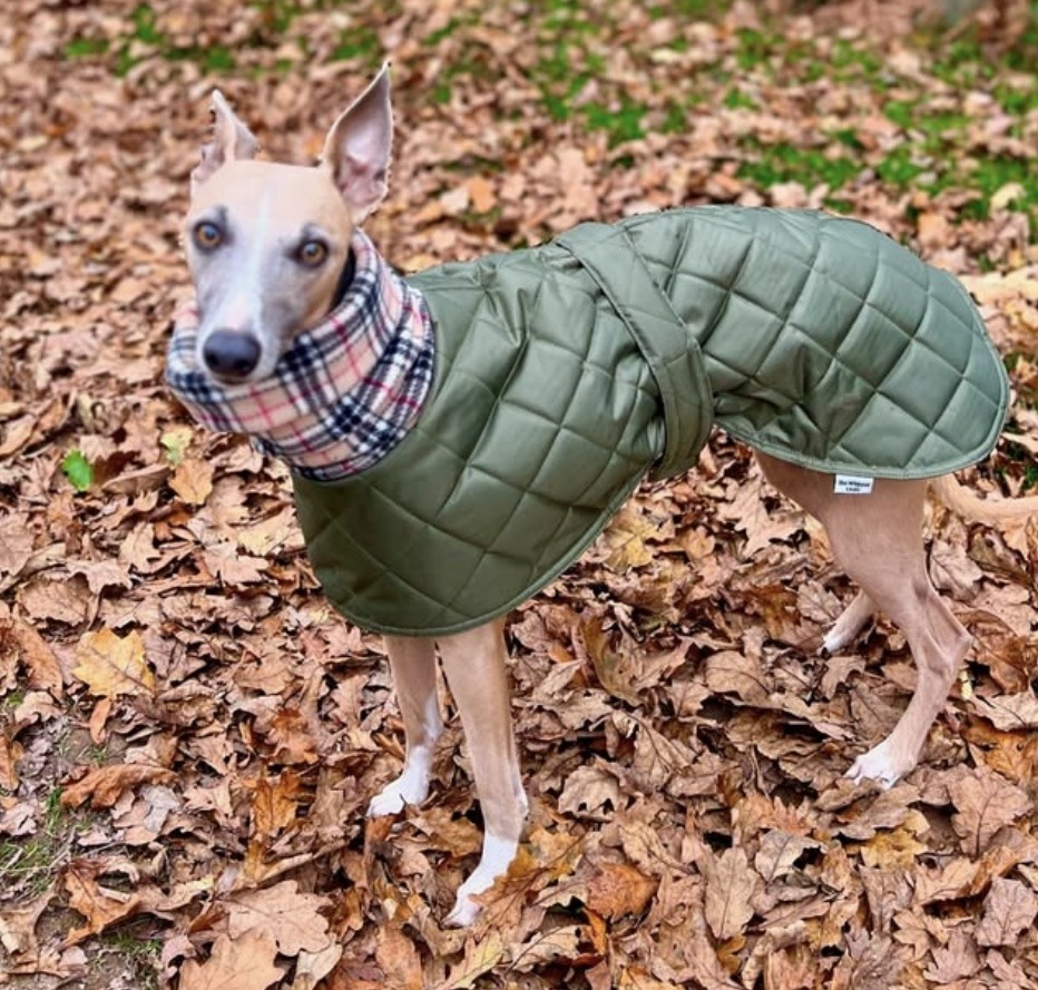 These winter coats are made to order and are cut to fit the shape of your greyhound, sighthound ,whippet or Italian greyhound. There are made with Quilted 2oz wadding onto 4oz waterproof polyester and are fully lined with quality polar fleece.