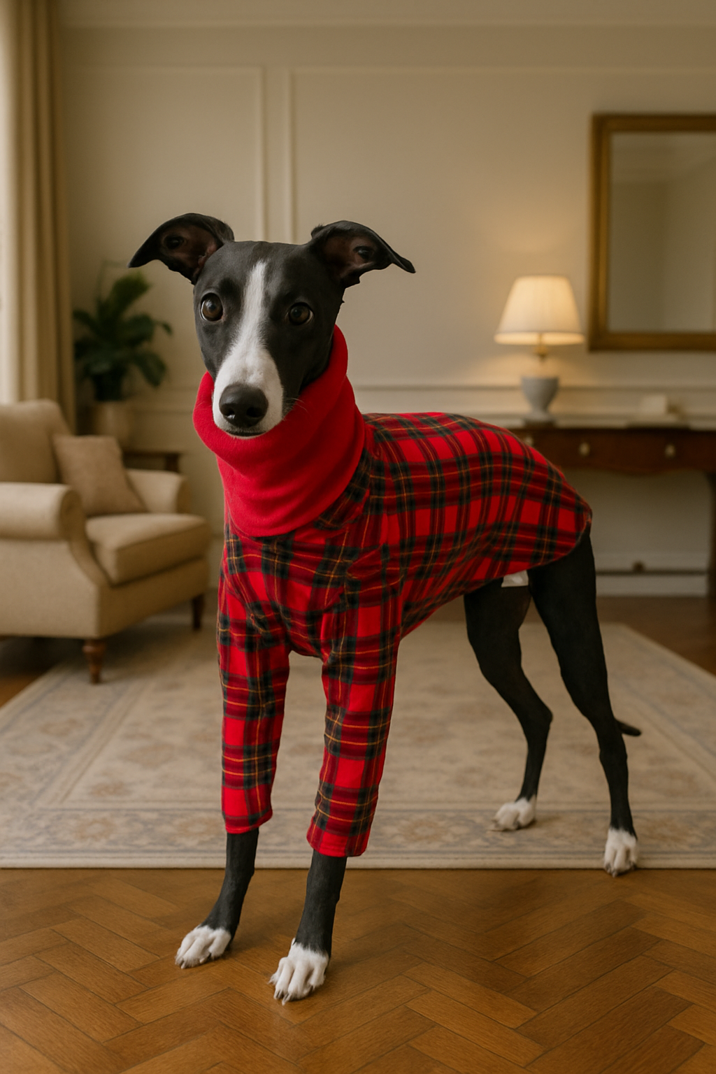 Treat your sighthound to a cozy night with our handmade 2-leg polar fleece pajamas. Designed especially for breeds like Italian Greyhounds, Whippets, Lurchers, and Greyhounds, these pajamas feature a snug polo neck, long sleeves, and an open underside—perfect for toileting needs.